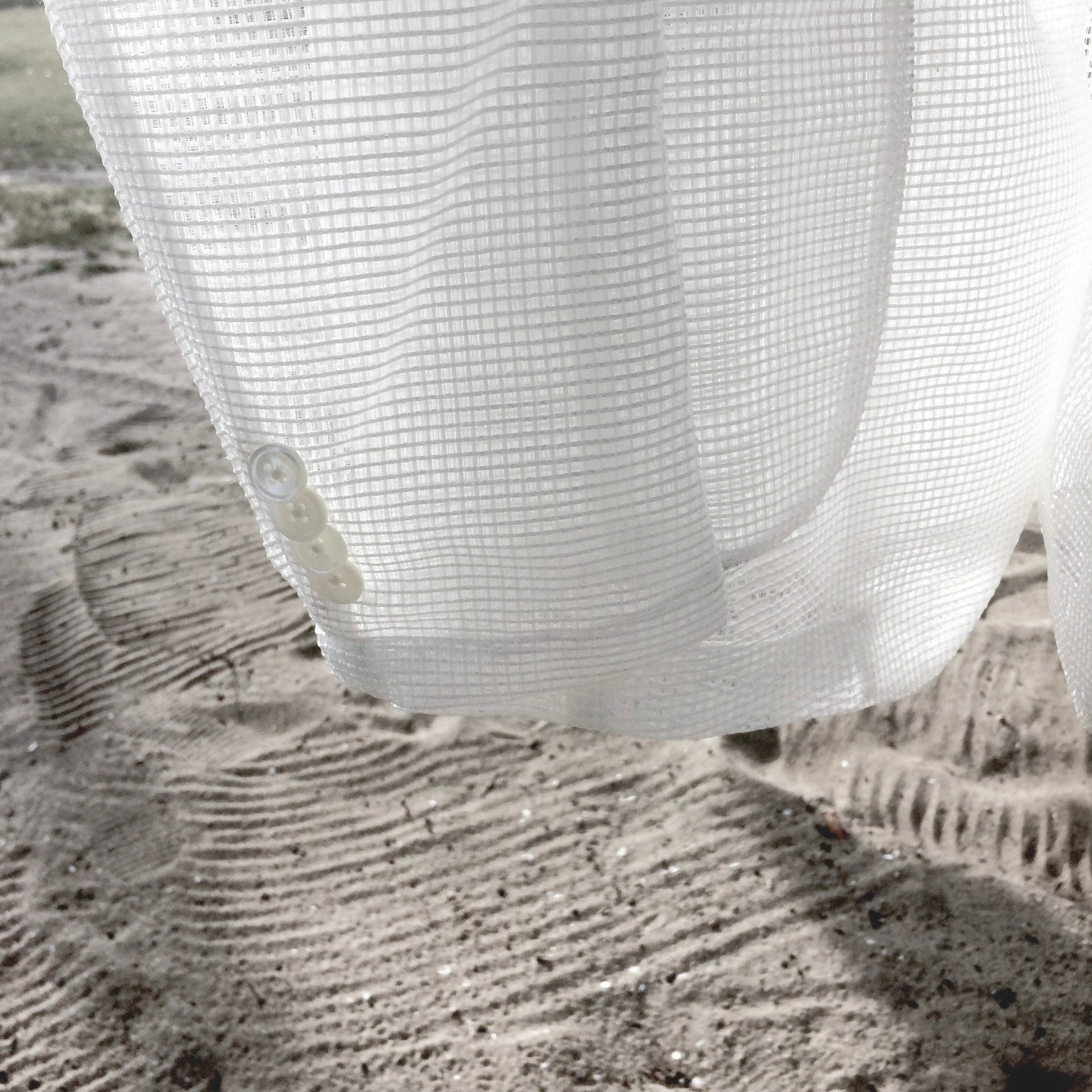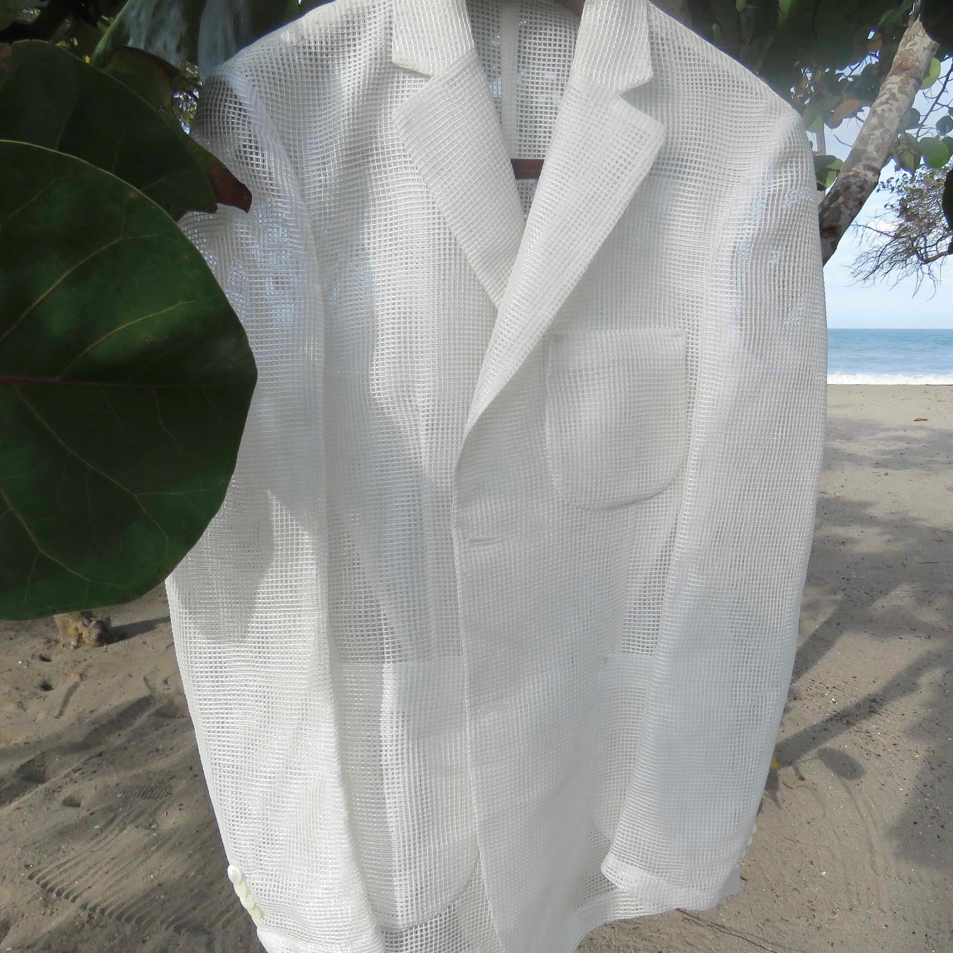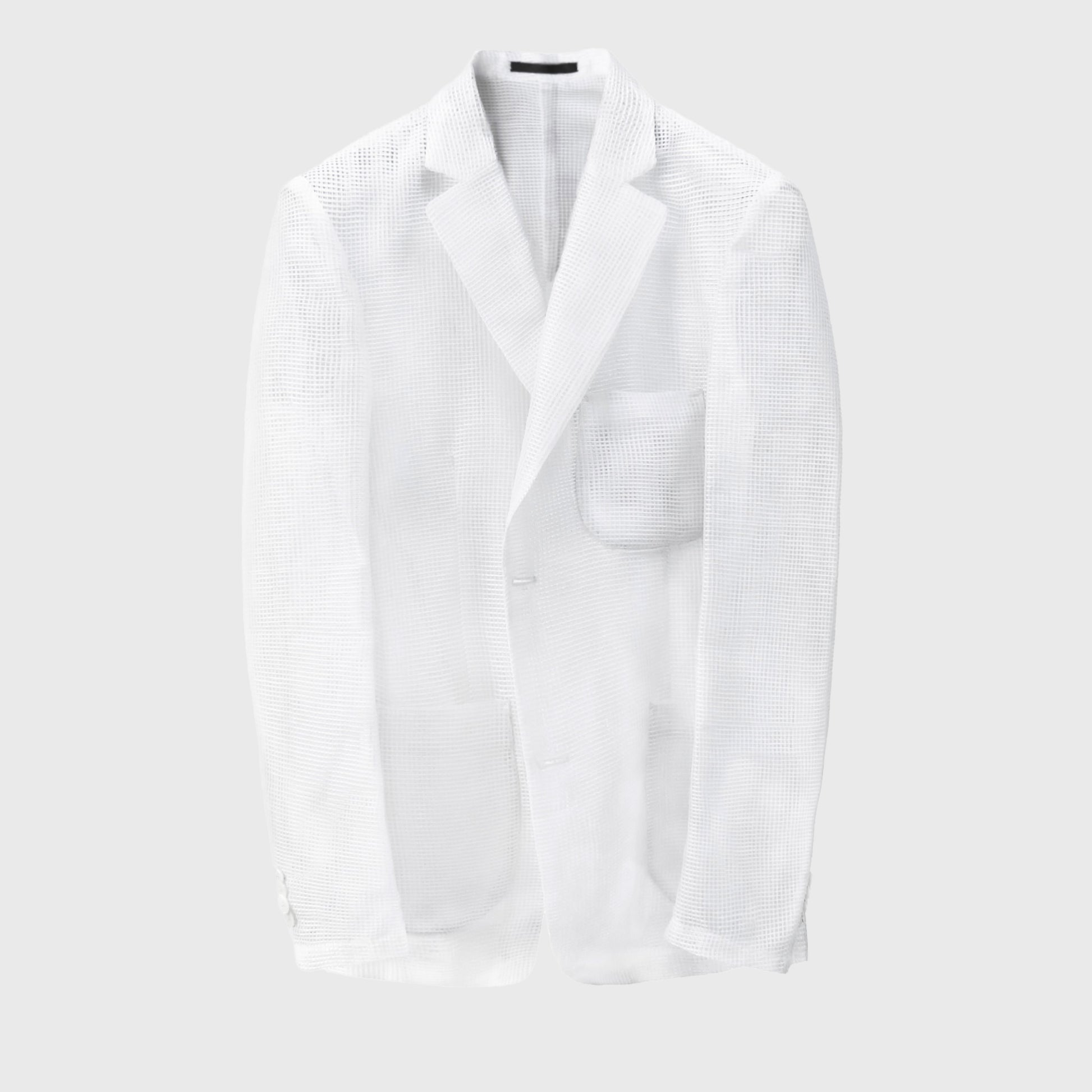 Confeccionada en tejido mesh blanco 100% poliéster, ofrece durabilidad, facilidad de cuidado y excelente ventilación. Su estructura abierta favorece la circulación del aire sin perder una silueta limpia de inspiración sartorial.